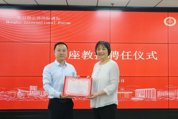 图为张俊副校长为冯汉华博士颁发客座教授聘书 摄影:鲍可