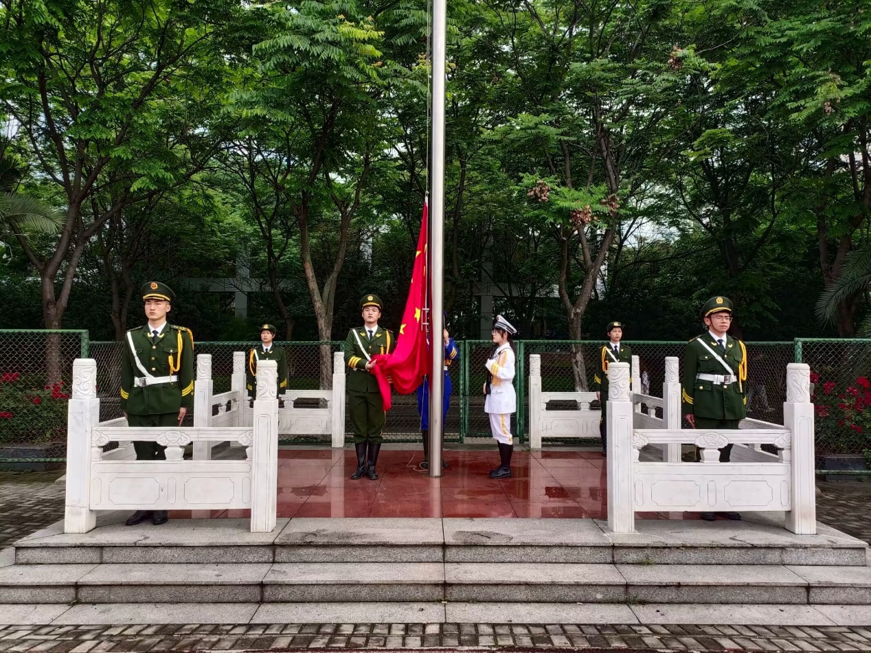 7点升旗仪式准时进行,现场随着仪仗队的出现而安静下来。庄严的仪仗队护卫着国旗走入场内,国旗护卫队的队员迈着整齐的步伐护送国旗入场。伴着庄严嘹亮的国歌,五星红旗冉冉升起,全体师生怀着崇敬与喜悦的心情,对着迎风飘扬的五星红旗行注目礼,心中无比自豪。