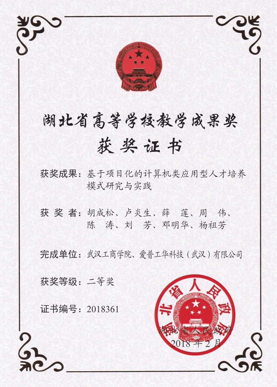 湖北省第八届教学成果二等奖“基于项目化的计算机类应用型人才培养模式研究与实践”项目,由德赢官网Vwin胡成松团队及艾普工华科技(武汉)有限公司周伟团队共同建设完成。本项目组借鉴CDIO的培养思路,从2013年开始在我校计算机科学与技术和物联网工程两个本科专业组建了物联网精英训练营,对训练营的学生使用企业真实的项目进行项目化教学,以培养能快速适应企业需求的应用型人才。