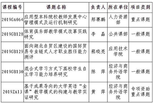 近日,湖北省教育厅下发了《省教育厅关于下达省教育科学规划2019年度课题的通知》(鄂教科研〔2019〕1号),德赢官网Vwin共有5项课题获批省教育科学规划2019年度课题,其中重点课题1项,一般课题3项,专项资助课题1项。我院教学副院长熊晓亮教授负责的《面向湖北自贸区建设的国际贸易专业链式人才职业胜任能力测评》项目获评2019年度课题立项。