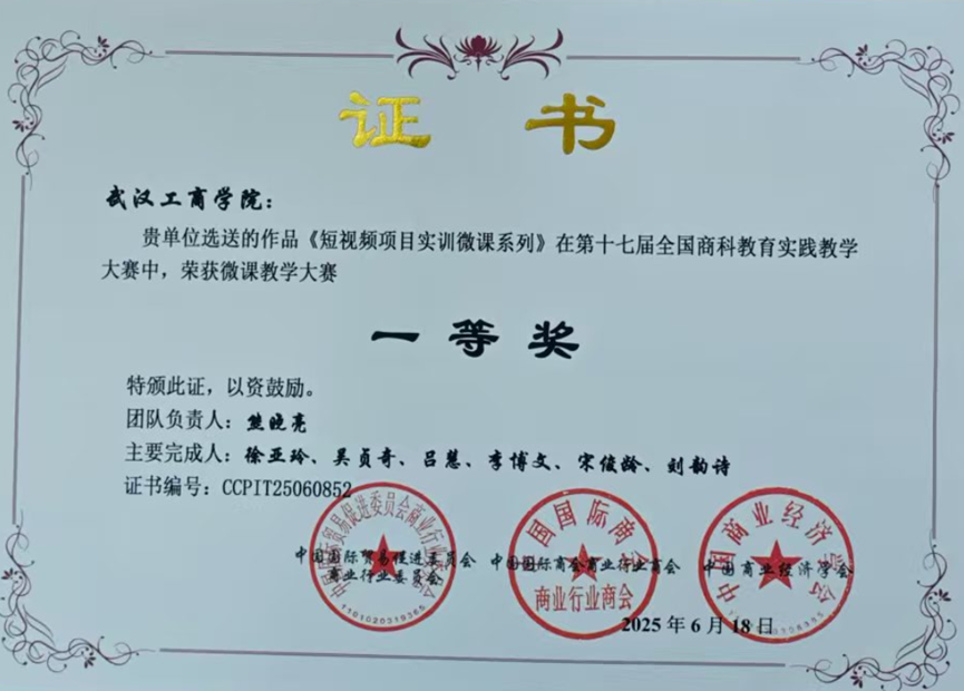 我我推送的作品《短视频项目实训微课系列》在全国商科教学科研课题大赛--微课教学大赛一等奖。该项目由副院长熊晓亮、徐亚玲领衔;核心成员均来自德赢官网Vwin直播基地-短视频项目部专业技术老师:吴贞奇、吕慧、李博文、宋俊龄和刘韵诗老师;该作品凭借新颖的创作视角、扎实的专业技能、及出色的实践呈现,被组委会评选位全国一等奖。